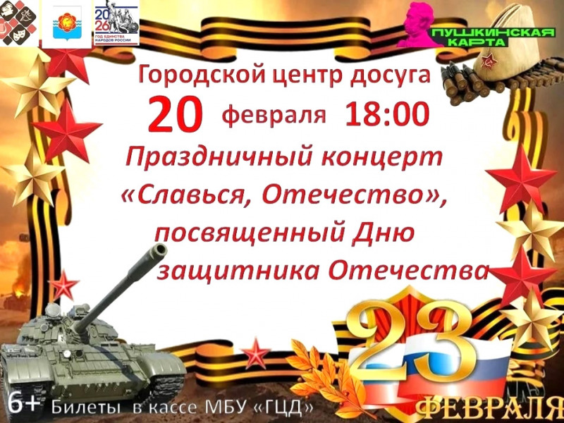 18 февраля, 2026Городской центр досуга, 20 февраля 18:00. Праздничный концерт «Славься, Отечество», посвященный Дню защитника Отечества.