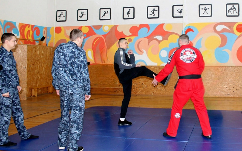 Специальное спортивное занятие для представителей колонии-поселения № 5 провел главный тренер клуба «Боевая Русь», председатель судейской коллегии федерации Универсального боя Смоленской области, победитель и призер всероссийских соревнований Олег Горный. Отличная физическая подготовка сотрудников ведомства является залогом их успешной служебной деятельности. Регулярные занятия спортом - обязательное требование для личного состава уголовно-исполнительной системы - помогают обеспечить собственную безопасность, справиться со стрессом и снять эмоциональное напряжение. Кроме того, работа в команде, как известно, способствует сплочению коллектива не только на спортивной площадке, но и в целом на службе. Прежде чем начать тренировку, Олег Горный рассказал сотрудникам учреждения об истории возникновения в России такого силового двоеборья, как универсальный бой, его разновидностях и правилах проведения, а также об основных приемах борьбы и навыках, которыми должен обладать профессиональный спортсмен. Затем участники мероприятия приступили к совместной тренировке. Они отработали основные приемы самозащиты, в том числе наиболее эффективные удары, способы освобождения от удушения и захватов, защиты от нападений. Особое внимание в ходе тренировки было уделено представительницам женского пола. Для сотрудниц учреждения, работа которых также связана непосредственно с осужденными, не менее важно обладать практическими навыками защиты и самообороны.