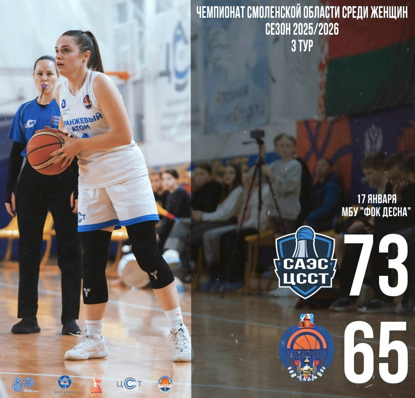 17 января атомщицы принимали действующего победителя чемпионата Смоленской области команду «Заднепровье» из Смоленска. Первая половина матча осталась за смолянками, но уже с начала третьей четверти нашей команде удалось выйти вперед и довести матч до победы со счетом 73:65. Взяли реванш за недавнее поражение в Смоленске. Алина Никитёнок, несмотря на перебор фолов в третьей четверти, смогла принести команде 21 очко, Дарья Левкина набрала 19 очков, Софья Белехова отметилась 15 очками. Женская команда «САЭС-ЦССТ» закончила первый круг чемпионата без поражений и лидирует с промежуточным результатом 3-0.