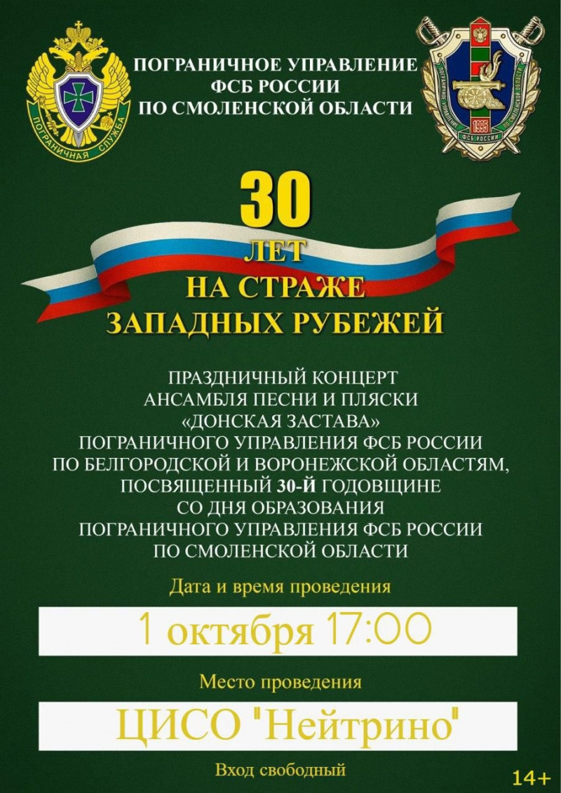 Праздничный концерт ансамбля песни и пляски «Донская застава» пограничного управления ФСБ России по белгородской и воронежской областям, посвященный 30-й годовщине со дня образования пограничного управления ФСБ России по смоленской области.