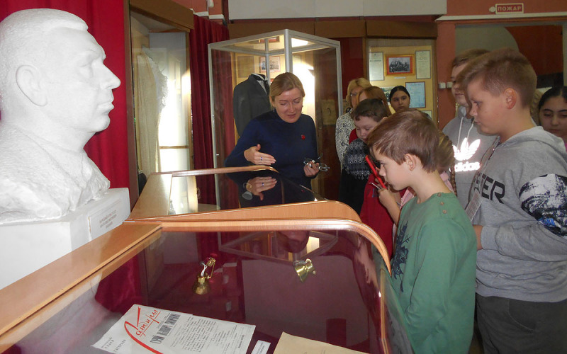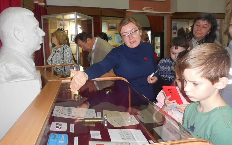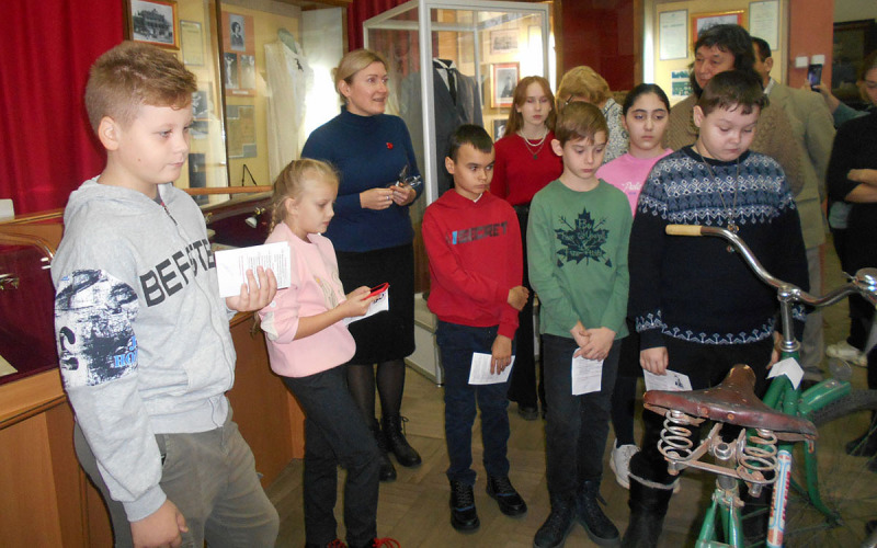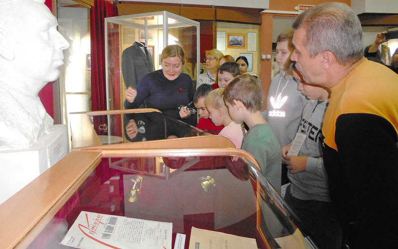 В рамках проведения IX Открытого международного театрального фестиваля им. А.Д. Папанова в Вяземском историко-краеведческом музее состоялась экскурсия, посвящённая 100-летию великого актёра. Экскурсию для вязьмичей, в большинстве детей, провела главный хранитель Вяземского историко-краеведческого музея Юлия Витальевна Петрова. Она популярно рассказала о развитие театрального искусства в нашем городе и наиболее подробно остановилась на экспозициях, посвященных Анатолию Дмитриевичу Папанову. Театральная традиция в Вязьме, как пояснила Юлия Витальевна, имеет глубокие корни. «Чтобы понять, как Анатолий Дмитриевич стал артистом, сказала она далее, - нужно познакомиться с театральной историей самого города, потому что сам Анатолий Дмитриевич подчёркивал, что его первые впечатления о том, что такое театр, зародились именно здесь в Вязьме, несмотря на то, что он покинул Вязьму в детском возрасте, и если бы здесь не была настолько сильна театральная традиция в начале двадцатого века, то, возможно, и Анатолий Дмитриевич стал кем-то другим, а не артистом, любовь к театру передалась ему от отца, который занимался в театральной самодеятельности…». В день экскурсии Вяземский историко-краеведческий музей посетила дочь великого актёра Елена Анатольевна Папанова, которая постоянно возглавляет жюри театрального фестиваля имени её отца. Благодаря ей, экспозиция, в которой представлены личные вещи Анатолия Дмитриевича Папанова – театральный фрак и джинсовый костюм, дачный велосипед, чашка, рабочий стол – а также афиши и программы театральных постановок, фотографии сцен из спектаклей, в которых принимал участие А.Д. Папанов, будучи одним из ведущих актёров театра сатиры, постоянно пополняется. В этот приезд в Вязьму Елена Анатольевна подарила нашему музею клюшку с автографами игроков хоккейной команды «Спартак», которая была подарена А. Д. Папанову, как неизменному болельщику этой команды. Раритетный экспонат пополнит коллекцию, которая становится богаче с каждым годом, и вскоре, как пояснила Юлия Витальевна, будет достойна целого зала в Вяземском историко-краеведческом музее.