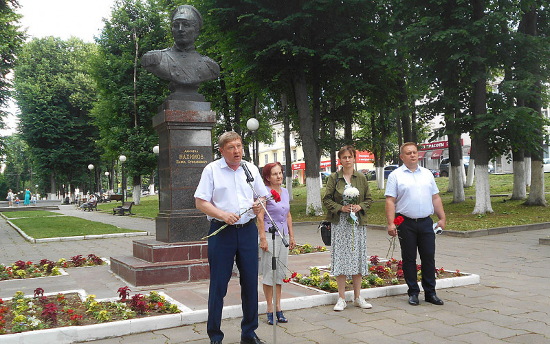 Пятого июля, в день рождения прославленного адмирала, уроженца Вяземской земли Павла Степановича Нахимова, в сквере его имени состоялся памятный митинг. Собираться ежегодно в этот памятный день в одном из красивейших уголков нашего города у памятника Павлу Степановичу Нахимову давно стало для вязьмичей доброй традицией. Об основных вехах героического пути выдающегося флотоводца, нашего земляка, которого чтят и помнят во многих российских городах и, прежде всего, в Севастополе, напомнил в своём выступлении глава Вяземского городского поселения Александр Аркадьевич Григорьев. «В следующем году, - сказал он далее, - наша страна отметит большую дату - 220лет со дня рождения П.С. Нахимова. Я думаю, что инициаторами многих мероприятий должны стать вязьмичи … В ближайшее время будет разработана программа празднования, я надеюсь, что новый вид приобретёт сквер П.С. Нахимова…Очень хотелось бы, чтобы, в первую очередь, молодёжь отметила эту дату…в течение года мы планируем провести огромное количество экскурсий…мне кажется, что кадеты военно-морских училищ просто обязаны побывать на Вяземской земле и поклониться памяти Павла Степановича… Я поздравляю нас всех… пусть вязьмичи гордятся тем, что живут на земле, где родился этот замечательный человек». От имени Вяземского районного совета депутатов участников митинга приветствовал его председатель Валерий Михайлович Никуличев: «…жаль, что в связи с пандемией, нет среди нас молодёжи… Это как раз для них пример – подвиг, который совершил Павел Степанович Нахимов…». «Прекрасный летний день, - сказала депутат Вяземского городского совета Галина Ивановна Мимангалиева, - подарил нам этого замечательного, удивительного человека, который прославил всю великую Россию. Мы чтим его память, гордимся им, говорим об этом в школах и других учебных заведениях… Вяземские подростки поступают в Нахимовское училище, они идут с великой мечтой в море, дабы тоже прославлять Россию своими нынешними делами…». Директор Государственного историко-культурного и природного музея-заповедника А.С. Грибоедова «Хмелита» Надежда Викторовна Кулакова говорила, как важно посещать места, связанные с именами наших героев-патриотов, и сообщила о том, что музей-заповедник уже передал приветы и поздравления от Вяземской земли Министерству культуры города Севастополя, своим коллегам Военно-исторического музея Санкт-Петербурга. К подножию памятника Павлу Степановичу Нахимову были возложены красные гвоздики.