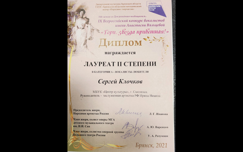 Сергей стал лауреатом II степени в категории «вокалисты-любители». Конкурс прошёл в Брянске и проводился в рамках регионального проекта «Творческие люди» Национального проекта «Культура». В нем приняли участие 18 солистов-вокалистов из 6 регионов нашей страны: г. Москва, Смоленской, Брянской, Московской, Орловской и Калужской областей. Конкурсанты оценивались по двум категориям: категория А - вокалисты-любители в возрасте от 18 до 50 лет; категория В - учащиеся и студенты высших и средних специальных учебных заведений. Программа конкурсного выступления включала: Оценивало конкурсантов высокопрофессиональное жюри - преподаватели музыкального училища имени Гнесиных и участники труппы Большого театра во главе с председателем жюри Ивановой Людмилой Георгиевной, народной артисткой России, заслуженным деятелем музыкального искусства, заведующей вокальным отделом ГМУ им. Гнесиных, доцентом РАМ им. Гнесиных, членом Президиума Международного Союза Музыкальных деятелей, обладателем золотой медали Н.И. Сац «За выдающийся вклад в развитие искусства». По результатам конкурсных прослушиваний в категории А - вокалисты-любители Сергей Клочков стал лауреатом II степени. Он исполнил арию Мельника из оперы Даргомыжского «Русалка» и романс Николая Зубова «Молчи!..» из репертуара Анастасии Вяльцевой. Успешно также выступили в данной номинации и земляки Сергея. Так, Юлия Левина стала лауреатом III степени, а Мария Андреюк - дипломантом конкурса. В категории В - студенты средних и высших специальных (музыкальных) учебных заведений лауреатом III степени стал Марк Ягнешко, а Юлия Солдатова - дипломантом конкурса. Они учатся в Смоленском областном музыкальном училище им. М.И. Глинки. Кроме того, среди смолян дипломом «Лучший концертмейстер» отмечена Ирина Гончарова. Завершился фестиваль награждением победителей и лауреатов. После церемонии награждения состоялся гала-концерт. Лучшие вокалисты исполнили оперные арии и романсы великой вокалистки, чьё 150-летие отмечается в этом году. В гала-концерте также приняли участие члены жюри - народная артистка России Людмила Иванова, солист музыкального театра им. Наталии Сац Антон Варенцов и солистка оперной труппы Большого театра России Ульяна Разумная.