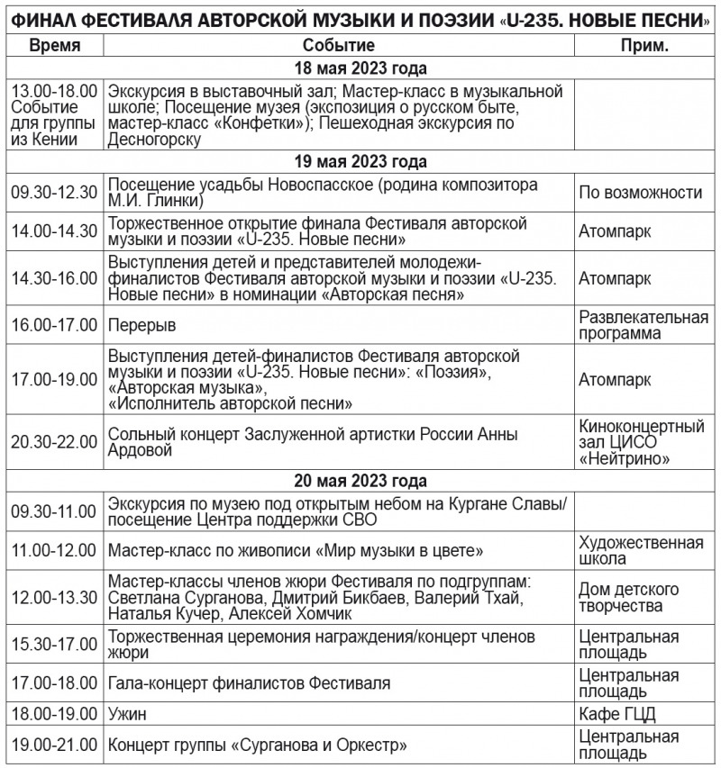 Уникальное событие – фестиваль авторской музыки и поэзии «U-235. Новые песни» – состоится в Десногорске, городе-спутнике Смоленской АЭС, 19-21 мая. Право быть столицей фестиваля город завоевал в честной борьбе с другими атомными городами. Мероприятие реализуется при поддержке Концерна «Росэнергоатом», проекта «Школа Росатома» и программы «Территория культуры Росатома». Участниками фестиваля станут таланты, которые в своем творчестве выражают любовь к Отчизне и родному краю, культуре своего народа, общечеловеческим ценностям. Отборочные туры проходили в течение полугода в городах России и за рубежом. «Концерн «Росэнергоатом» уделяет большое внимание культурному развитию территорий присутствия и поддержке творчески одаренных жителей атомных городов. Молодые таланты всегда ищут средства самовыражения, и фестиваль – это именно та площадка, где можно показать себя, воплотить свои творческие идеи в жизнь. В рамках мероприятия будет организована не только концертная программа, но и мастер-классы от профессионалов своего дела. Этот фестиваль объединит всю творческую молодежь территорий присутствия Росатома и станет отличным стимулом для развития молодых талантов», – отметил первый заместитель Генерального директора по корпоративным функциям АО «Концерн Росэнергоатом» Джумбери Ткебучава. На сцене фестиваля выступят исполнители авторской песни из 22 городов России, а также зарубежные гости из Армении, Беларуси, Египта, Турции, Замбии, Кении и Шри-Ланки – всего 64 финалиста от 10 до 35 лет. Концерты состоятся на самых знаковых площадках города. Как и все события проекта “Школа Росатома”, фестиваль “U-235. Новые песни” воспитывает доброе и умное подрастающее поколение – будущее нашей страны.