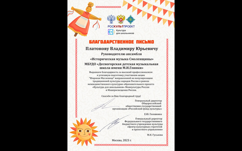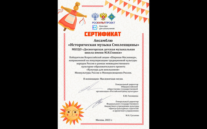 Подведены итоги Всероссийской онлайн-акции «Широкая Масленица», которая проводилась в рамках проекта «Культура для школьников», организованного Министерством культуры России. Акция проходила с 20 по 26 февраля 2023 года и была направлена на популяризацию традиционной культуры народов России. Участникам было предложено опубликовать свои работы на тему Масленицы по трем номинациям: масленичная песня, масленичная кукла-чучело, устное творчество. Из огромного количества коллективов и солистов (10500 участников со всей страны) выбирали 10 Победителей в каждой номинации! В номинации "Масленичная песня" Победителем стал коллектив "Историческая музыка Смоленщины" под руководством Владимира Платонова Десногорской Детской музыкальной школы им. М.И.Глинки. Россия – огромная страна с многообразными народными традициями и подрастающее поколение должно знать свое национальное богатство. Акция объединила коллективы со всех уголков страны. Участники Адыгеи, Башкирии, Карачаево-Черкесии, Татарстана и Чувашии показали свои национальные традиции проводов зимы и встречи весны. Большое количество участников акции было из Санкт-Петербурга, Краснодарского края, Республик Башкортостан и Татарстан, из Калужской, Курской, Московской, Ростовской, Сахалинской,и Челябинской областей. Поздравляем ансамбль "Историческая музыка Смоленщины" с прекрасный результатом! Благодарим за Высокую оценку организаторов! Работы Победителей можно увидеть на портале Культурадляшкольников.РФ в разделе «Ты в КДШ». Члены жюри поблагодарили всех участников и поделились своими впечатлениями от просмотра работ: Наталья Валерьевна Кривчикова-заведущая отделом самодеятельного народного творчества ГБУК "Белгородский государственный центр народного творчества": «Дорогие участники акции «Широкая Масленица»! Сегодня в нашей стране одна из главных задач – сохранение национального своеобразия народов России. А нематериальное культурное наследие, завещанное нашими предками – это уникальный, особенный и чудесный дар, наполненный старинными знаниями, музыкой и поэтикой. В рамках акции каждый из вас достойно представил культуру своей малой Родины, прекрасные традиции своих прабабушек, бесценные древние обрядовые песни. Вы истинные наследники сокровища, подаренного всем нам нашими прадедами. Желаю творческих успехов и неиссякаемого источника вдохновения!» Елена Владимировна Бессонова- директор МУК Центра традиционной русской культуры южного Подмосковья "Истоки", руководитель фольклорно-этнографического ансамбля "Истоки": «Дорогие ребята! Дорогие педагоги! Мне было очень приятно окунуться в детское творчество. Знание наших исконных традиций - залог нашего уверенного будущего. Я рада, что Масленица объединила детей разных национальностей из разных уголков нашей Великой России! В своих работах дети проявили знание русских традиций, русского языка, литературы, народного театра, костюма. И было много детской фантазии, импровизации, перевоплощения - было много радости! И это самое главное! Наши дети должны быть самыми счастливыми и радостными на всей планете! Спасибо всем!!! А мы - я и мои сотрудники, действительно получили огромное удовольствие от просмотра роликов! То, что я написала, совершенно искренне, от души! Спасибо Вам за этот проект, он очень важный и актуа