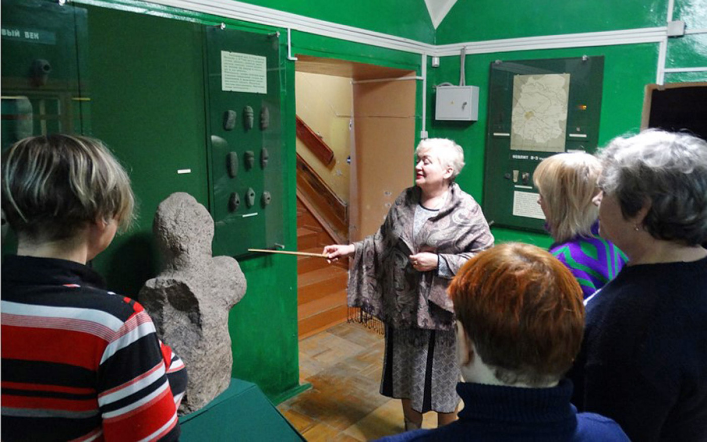 В ноябре этого года Рославльский историко-художественный музей отмечает юбилей – 105 лет открытия для посетителей. В археологическом зале музея экспонируется древнейший памятник дохристианских религиозных верований, который датируется I половиной I тысячелетия до н. э. На сегодняшний день это, практически, единственный уцелевший экспонат из довоенной музейной коллекции, которая была утрачена в период оккупации города немецко-фашистскими войсками в 1941- 1943 гг. Он был обнаружен в 1913 году основателем и первым директором местного музея Природы и истории края С. М. Соколовским, на левом берегу р. Остер, недалеко от деревни Козлово. В 1920 году в составе других коллекций предмет поступил в Рославльский музей. Причудливое каменное изваяние из серого известняка, традиционно трактуемое как «крест», не одно столетие простояло на открытом воздухе и в 1991 г. было помещено в залы современного музея. Этот экспонат как бы соединил в единое целое первую музейную экспозицию с возрожденным послевоенным музеем, поэтому рассказ о нем всегда вызывает интерес у посетителей. К тому же, в фондах Рославльского историко-художественного музея хранится любопытный любительский снимок (датируется приблизительно 1914 годом) из личной коллекции хореографа Центра развития творчества детей и юношества Е.Н. Волковой. На фотографии – рядом с каменным идолом стоят две женщины, одна из которых – Маркова Анна Васильевна, учительница Хорошовской школы. На протяжении ряда лет она ходила до места работы по «хорошовскому большаку» мимо д. Козлово, что находится в 7 км от Рославля. Благодаря этой фотографии, спустя почти столетие мы увидели этот необычный камень в месте его первоначального бытования.
