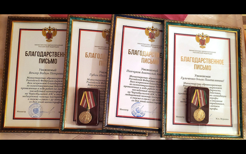 16 августа в клубе «Ностальжи» председателем Десногорской городской общественной организации «По поддержке пострадавших от Чернобыльской катастрофы» Тальятом Мамедовым в дружеской обстановке были вручены благодарственные письма врачам-героям за подписью Министра здравоохранения Российской Федерации М.А. Мурашко. За самоотверженные действия, проявленные в ходе работ по ликвидации последствий катастрофы на Чернобыльской АЭС и оказанию медицинской помощи пострадавшим, а также в связи с 35-летием со дня этой катастрофы благодарственными письмами награждены: - Венгер Вадим Петрович - Губин Иван Леонидович - Гульченко Ольга Пантелеевна - Пинчуков Анатолий Андреевич Иван Леонидович и Ольга Пантелеевна также получили памятные медали с 35-летием со дня катастрофы на Чернобыльской АЭС. Ольга Пантелеевна в этот день принимала поздравление в честь своего юбилея - ей исполнилось ровно 80 лет. Мы поздравляем наших дорогих врачей с заслуженными наградами и выражаем глубокую признательность и искреннюю благодарность за совершенный подвиг, ведь по-другому и не скажешь, за их безграничное самопожертвование и бесценную помощь людям в условиях такой опасной катастрофы.