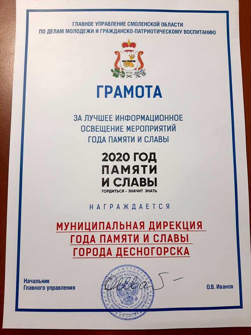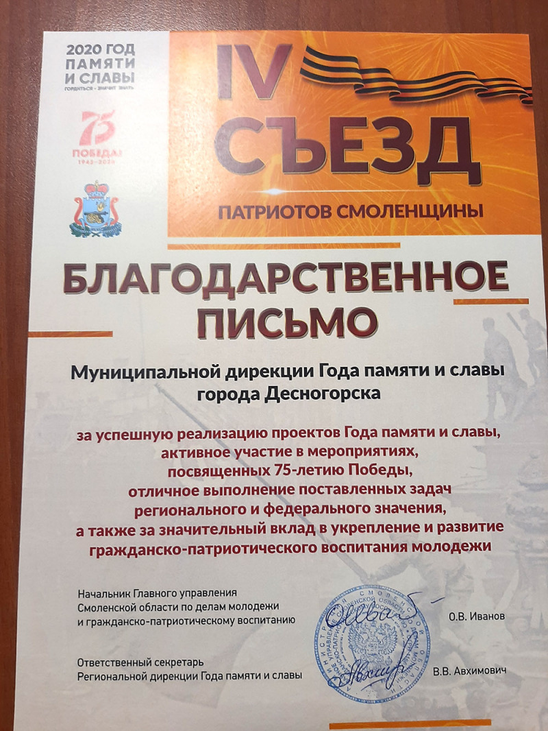 14 декабря 2020 года в областном государственном бюджетном учреждении культуры «Культурно-досуговый центр «Губернский» прошел IV Съезд патриотов Смоленщины, на котором были подведены итоги Года памяти и славы. В рамках программы прошло пленарное заседание, выступали докладчики и состоялось награждение представителей муниципальных образований в области гражданско-патриотического воспитания и молодежной политики. Благодарственным письмом Главного управления Смоленской области по делам молодежи и гражданско-патриотическому воспитанию награждена муниципальная дирекция Года памяти и славы нашего города, а также была вручена Грамота за лучшее информационное освещение мероприятий Года памяти и славы. Благодарственным письмом Главного управления Смоленской области по делам молодежи и гражданско-патриотическому воспитанию награжден Муниципальный волонтерский штаб города Десногорска за активную реализацию государственной молодежной политики и волонтерскую деятельность, направленную на реализацию проектов Года памяти и славы. 1 место в конкурсе на лучший проект в области гражданско-патриотического воспитания в номинации «лучший проект дошкольной образовательной организации» заняла Пищикова Наталья Николаевна (МБДОУ «Детский сад «Теремок» города Десногорска).