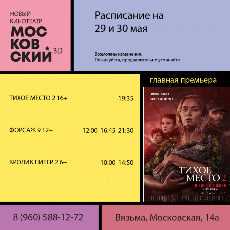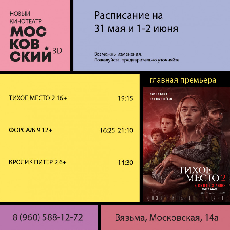 с 27 мая: Форсаж 9 (боевик, США 12+) Пила: Спираль (ужасы, США 18+) Кролик Питер 2 (комедия, США 6+) Расписание сеансов, пожалуйста, уточняйте по тел. +7 960 588-12-72 или на сайте www.vyazma.mastrota.su