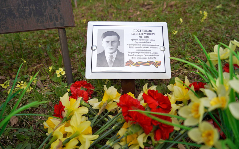 22 июня 1941 года началась страшная война - самая тяжелая и трагическая в истории нашей страны, война против мощного и жестокого противника, война, потребовавшая от нашего народа и его армии величайшего подвига, сил и терпения. Наши деды и прадеды выстояли и победили фашизм! 22 апреля в преддверии празднования 80-летия Победы десногорская делегация совместно с дорогобужскими земляками провели мероприятие по увековечиванию памяти солдата Великой Отечественной войны Постникова Павла Евграфовича, 1921 года рождения, уроженца Свердловской области. 1 мая 1941 года он был призван на срочную службу в Ново-Борисовск Республики Беларусь. А потом – Великая Отечественная война. Юный Павел Постников продолжал службу рядовым в бронетанковой части, но уже на Смоленской земле. С сентября месяца 1941 года считался без вести пропавшим. Спустя 84 года по многочисленных запросам родственников найдено место захоронения – в братской могиле в селе Алексино Дорогобужского района. Одни из тех, кто не только на словах, но и на деле сохраняют память о людях, защищавших за нашу Родину, присутствовали в составе десногорской делегации в гостях на дорогобужской земле: председатель Комитета по культуре, спорту и молодежной политике Администрации муниципального образования «город Десногорск» Смоленской области Анна Александровна Королёва; директор Десногорского историко-краеведческого музея Наталья Николаевна Демьянова; помощник руководителя приемной Галина Марковна Бородкина; журналисты Управления коммуникаций Инна Косенкова и Григорий Шилин; ведущая мероприятия Кристина Игоревна Удод, заведующий отделом по основной работе Городского центра досуга города Десногорска. К сожалению, родственники не смогли приехать, но были очень благодарны за оказанную помощь в поиске места захоронения и изготовление мемориальной доски приемной Общественного Совета ГК «Росатом» города Десногорска, и лично Андрею Николаевичу Алейникову. С приветственными словами выступили председатель Дорогобужской Думы Виталий Викторович Таранов, председатель Первичной ветеранской организации, менеджер сельского поселения Анна Васильевна Малащенкова и директор Алексинской средней школы Дина Николаевна Куриленкова. В завершение мероприятия собравшиеся почтили память всех погибших воинов Великой Отечественной войны минутой молчания и возложили цветы к братской могиле.
