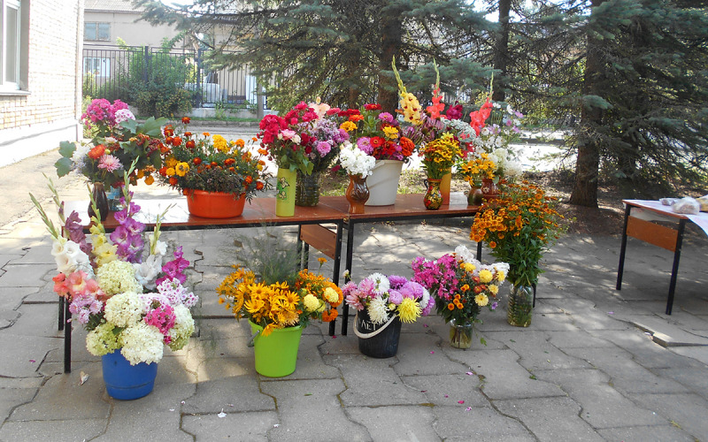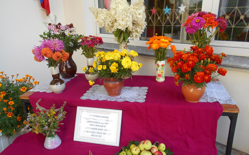На площадке у входа в Вяземскую центральную районную библиотеку была представлена выставка плодов членов клуба «Садовод-огородник». Выставка названа строчкой из известной песни «Вот и лето прошло…», но повода для грусти нет, как говорит руководитель Вяземского клуба «Садовод-огородник» Галина Владимировна Тарамбасова: «Потому что, когда смотришь на то, что представлено здесь, душа просто радуется, и не верится, что всё это выращено щедрыми заботливыми руками садоводов-огородников, истинных любителей нашей вяземской земли. Приглашаем всех вязьмичей к нам на выставку». Конечно, основу выставки и её украшение составили красочные цветочные композиции. Представлены также семена, яблоки, варенье… Полюбоваться многообразием выставки можно было, к сожалению, только один день. В вестибюле библиотеки оформлен уголок народного творчества. Экспонаты собирались в рамках Года культурного наследия народов России. Часть экспозиции названа «Мой уютный дом – наш любимый сад», выставленные здесь работы выполнены руками библиотекарей.