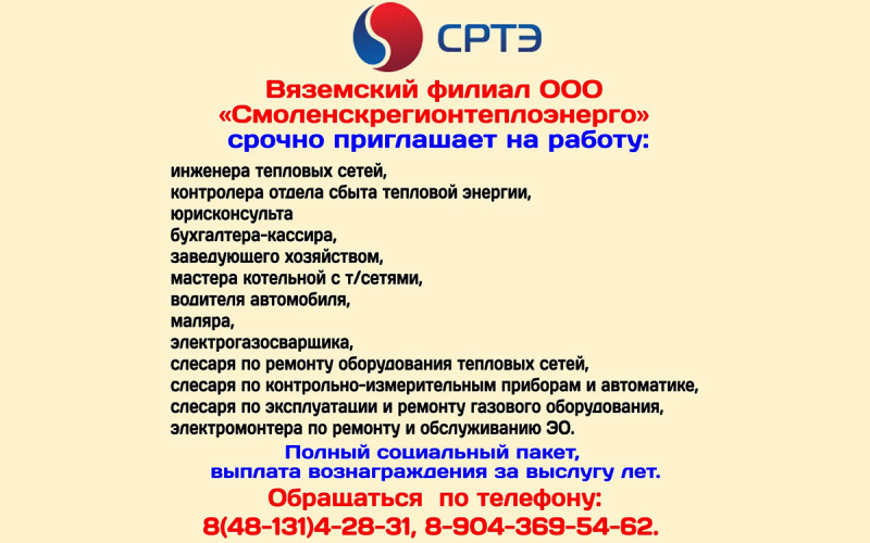 Подробнее...Вяземский филиал ООО «Смоленскрегионтеплоэнерго» срочно приглашает на работу: